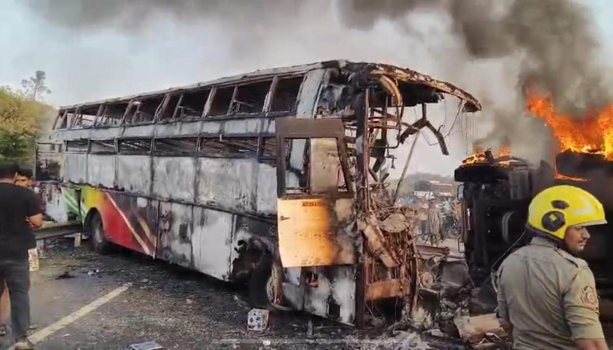 The incident occurred near Rayavaram around 6:30 a.m., close to a stone quarry. Following the collision, both vehicles were engulfed in flames and completely gutted. At the time of the accident, around 35 passengers were traveling in the bus, which belonged to Harikrishna Travels.
