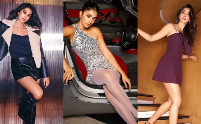 Showcasing three distinct outfits, Pooja experiments with playful yet polished silhouettes. From leg-baring designs to sharply structured fits, the styling remains tasteful and refined—accentuating her curves while maintaining a modern, chic aesthetic.