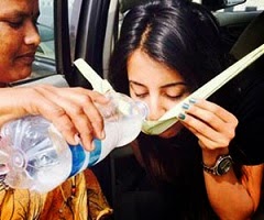 A picture of heroine Sanjjanaa drinking “Kallu” (Palm Wine) is now doing the rounds online. Sanjjanaa was seen drinking Kallu admiringly by stopping by her car on the roadside.