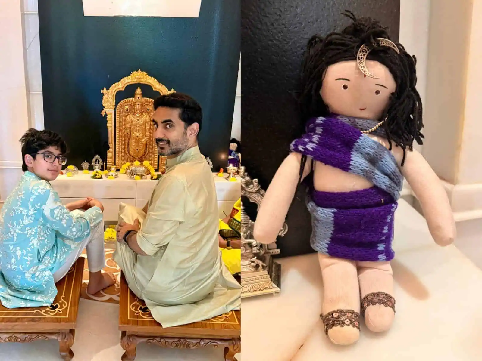 Recently, Nara Lokesh shared a heartfelt picture of himself and his son, Devaansh, praying on Ugadi Day. Behind them, in the pooja room, a small doll caught public attention.